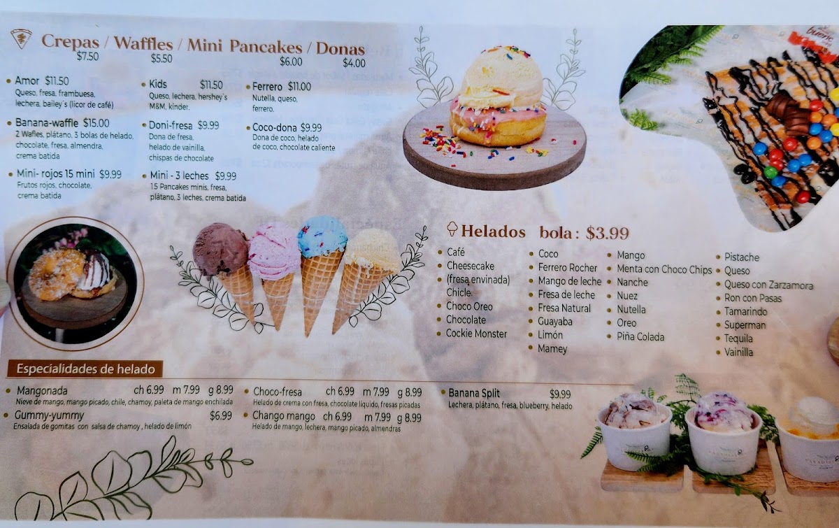 2 waffles (made fresh) act as the base to this banana split with a twist. Here is what you get in the Banana Waffle. 2 waffles as base, a split banana, 3 scoops of ice cream lined up (vanilla strawberry and chocolate). Drizzled in chocolate, Strawberries, Almonds, whipped cream and sprinkles. Can't forget the cherry on top! 2 waffles, plátano, 3 bolas de helado (vainilla, fresa, chocolate) , chocolate ,fresa , almendra, crema batida